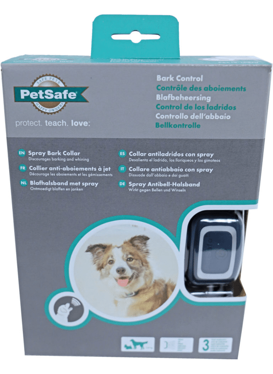 De PetSafe® anti-blafband met spray is eenvoudig te gebruiken en ontmoedigt blaffen. Als het geluid van het geblaf of gejank van uw hond de microfoon activeert, stoot de halsband een wolkje spray (35-40 keer per patroon) uit die honden als onaangenaam ervaren. De spray is niet schadelijk maar wel voldoende afschrikwekkend om bovenmatig blaffen te stoppen. Voor honden te gebruiken vanaf 3,6 kg. De spray is verwerkt in patronen, deze zijn eenvoudig te verwisselen. Bijgeleverd worden 2 patronen sprays: 1x citronella en 1x geurloos, deze zijn ook los na te bestellen. Er is een controlelicht voor een laag sprayniveau en laag batterijniveau. De batterij is oplaadbaar via de bijgeleverde USB-lader. De anti-blafband is waterdicht en verstelbaar.