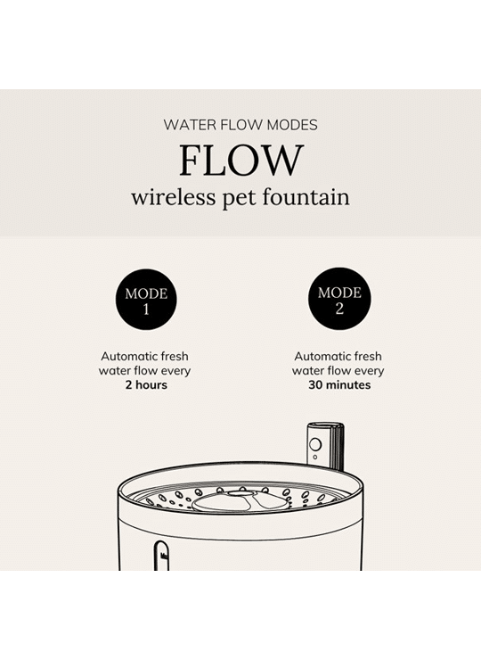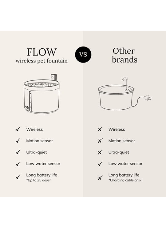Draadloos: De FLOW drinkfontein is draadloos en kan gemakkelijk in elkeruimte van het huis worden geplaatst, zodat huisdieren op een vertrouwde enrustige plek kunnen drinken. De oplaadbare batterij gaat tot 25 dagen mee,afhankelijk van het gebruik, en kan eenvoudig worden opgeladen.
