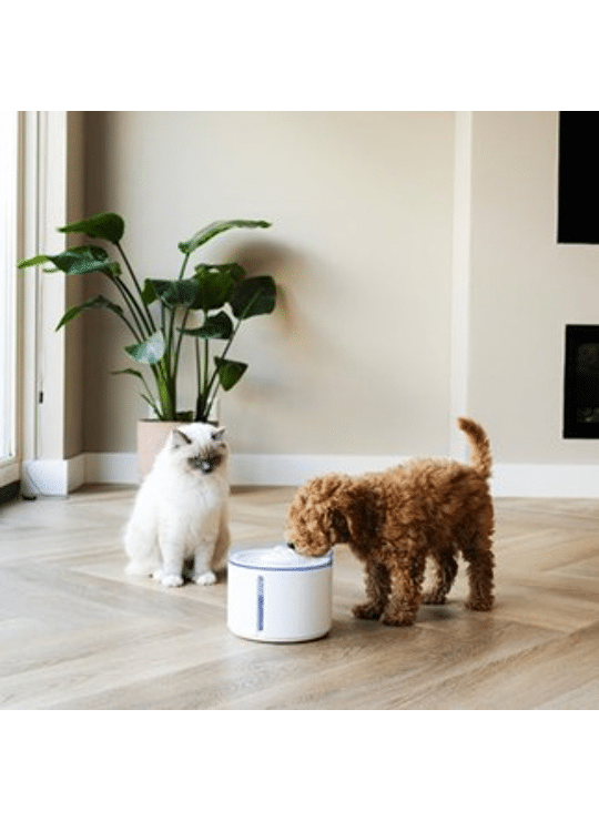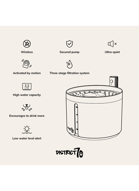 De District 70 FLOW draadloze drinkfontein is ontworpen omhuisdieren te stimuleren meer water te drinken, wat essentieel is voor hungezondheid en welzijn. Het circulerende water zorgt ervoor dat het water versoogt, wat de aandacht trekt van zowel katten als kleine honden. Dit kanbijdragen aan een verhoogde waterinname en daarmee het risico op nier- ofblaasproblemen verkleinen.