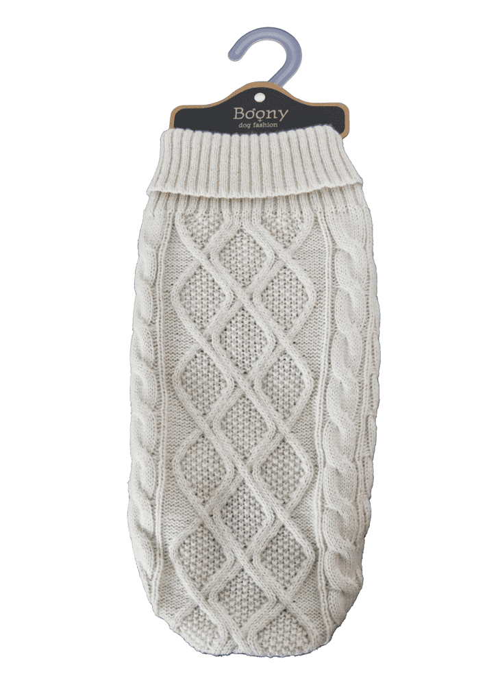 Met deze kabeltrui van het merk boony heeft uw hond het behaaglijk warm tijdens de winter. De trui heeft een open structuur waardoor hij goed ademend is en biedt zodoende een extra vachtlaagje voor uw hond. Deze kabeltrui beschikt over een warme dubbelgevouwen kraag die een extra bescherming geeft tegen koude omstandigheden.