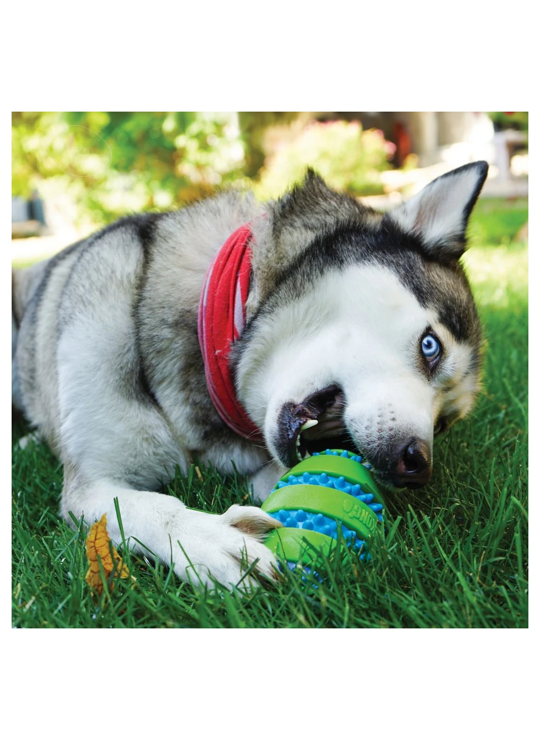 De Kong Squeez Goomz Ball heeft noppen die het tandvlees masseren en helpen hetgebit te reinigen. De gemengde structuren en het duurzame materiaal zorgen voorlang speelplezier, terwijl de natuurlijke kauwinstincten bevredigd worden. De bal heeft een pieper, waardoor het spelen met deze bal nog leuker is.