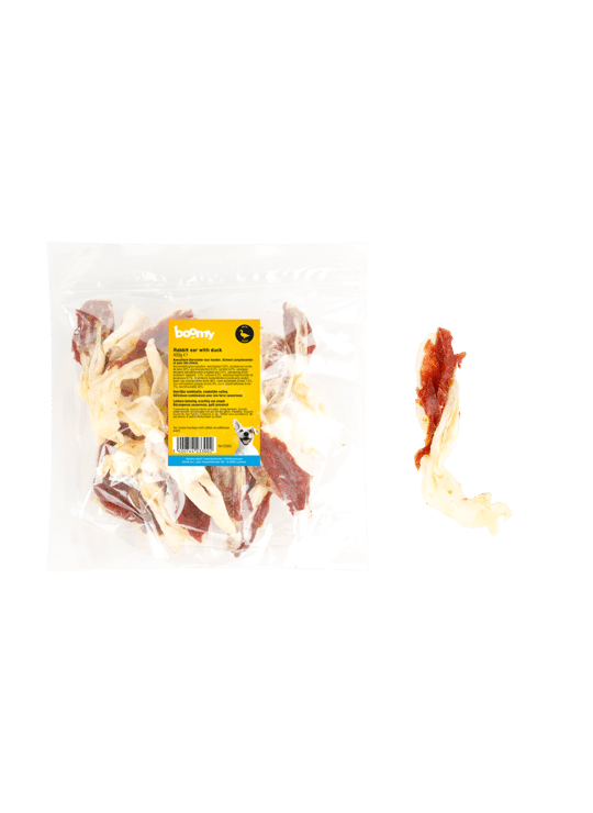 Konijnenoren met eend zijn een smakelijke en natuurlijkekauwsnack voor honden. Ze combineren de knapperige textuur van konijnenoor meteen heerlijke laag eend, wat zorgt voor extra smaak en plezier. Deze traktatieondersteunt het kauwinstinct en draagt bij aan een gezond gebit. Ideaal alsbeloning of tussendoortje voor honden van alle rassen.