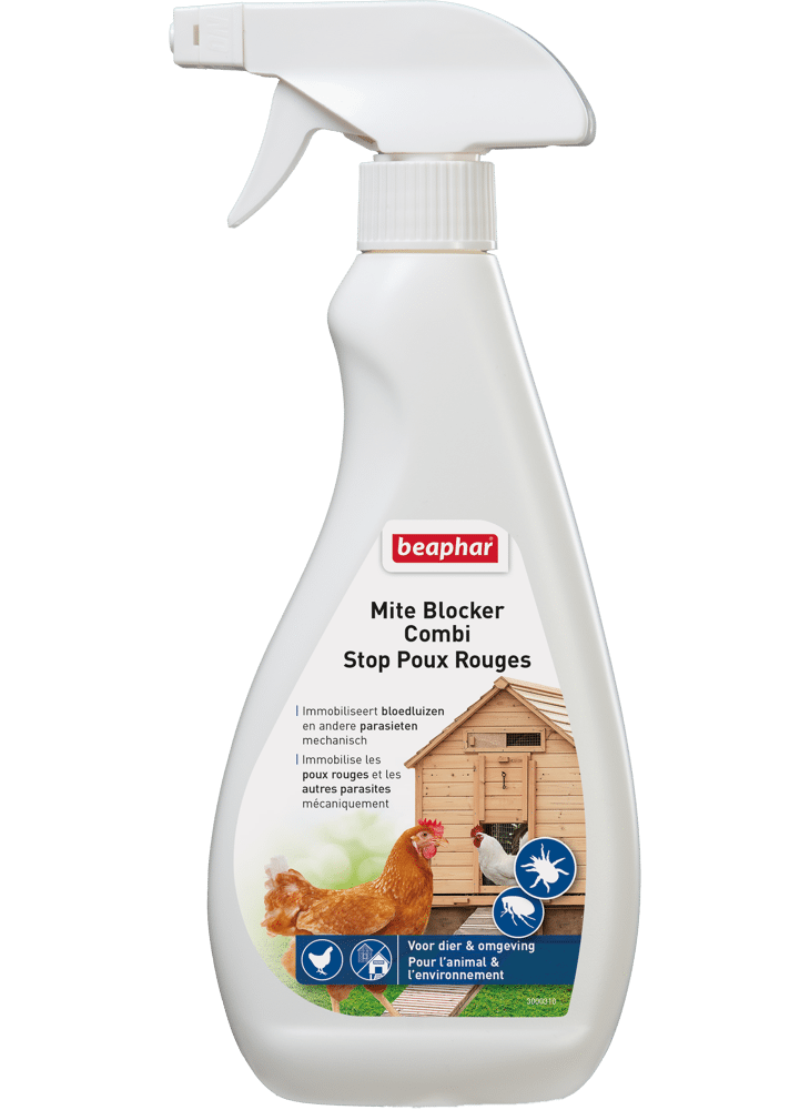 Gebruiksaanwijzing: Goed schudden voor gebruik. - Op het dier: Bespuit het verendek tegen de veerrichting in, van op een afstand van 10cm tot de veren lichtjes vochtig zijn. - Omgeving: Haal de dieren, de drink- en voederbakjes uit de kooi en maak grondig schoon. Vernevel daarna de Mite Blocker Combi op de zitstokken, de bodem en alle hoeken en spleten waar parasieten zich kunnen schuilhouden. Breng een tweede laag aan. Na de behandeling kunnen de dieren en de drink- en voederbakjes onmiddellijk terug geplaatst worden. De behandeling kan om de 5 dagen herhaald worden.