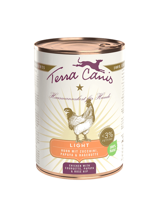 LIGHT TerraCanis-menu's bevatten weinig calorieën en vet. De verminderde portie vleeswordt gecompenseerd door een extra portie caloriearme groenten en fruit.Calorierijke granen worden opgegeven. Enzymen in ananas en papaja, hoogwaardigedruivenpitolie, kokosmeel en artisjokblad helpen de stofwisseling testimuleren. De vezelachtige materialen van psyllium zorgen ook voor een betergevoel van verzadiging. Terra Canis LIGHT-menu's zijn ontwikkeld doordierenartsen voor honden met licht overgewicht. Voor honden met extreemovergewicht adviseren wij de veterinaire lijn LOW FAT uit onsAliVet-assortiment.